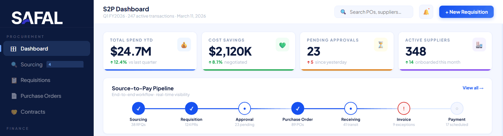 SAFAL applies AI across the entire Source to Pay lifecycle to reduce manual effort and keep work moving. From intake to approvals, sourcing to invoicing, the platform automates decisions, flags exceptions, and keeps stakeholders aligned in real time.